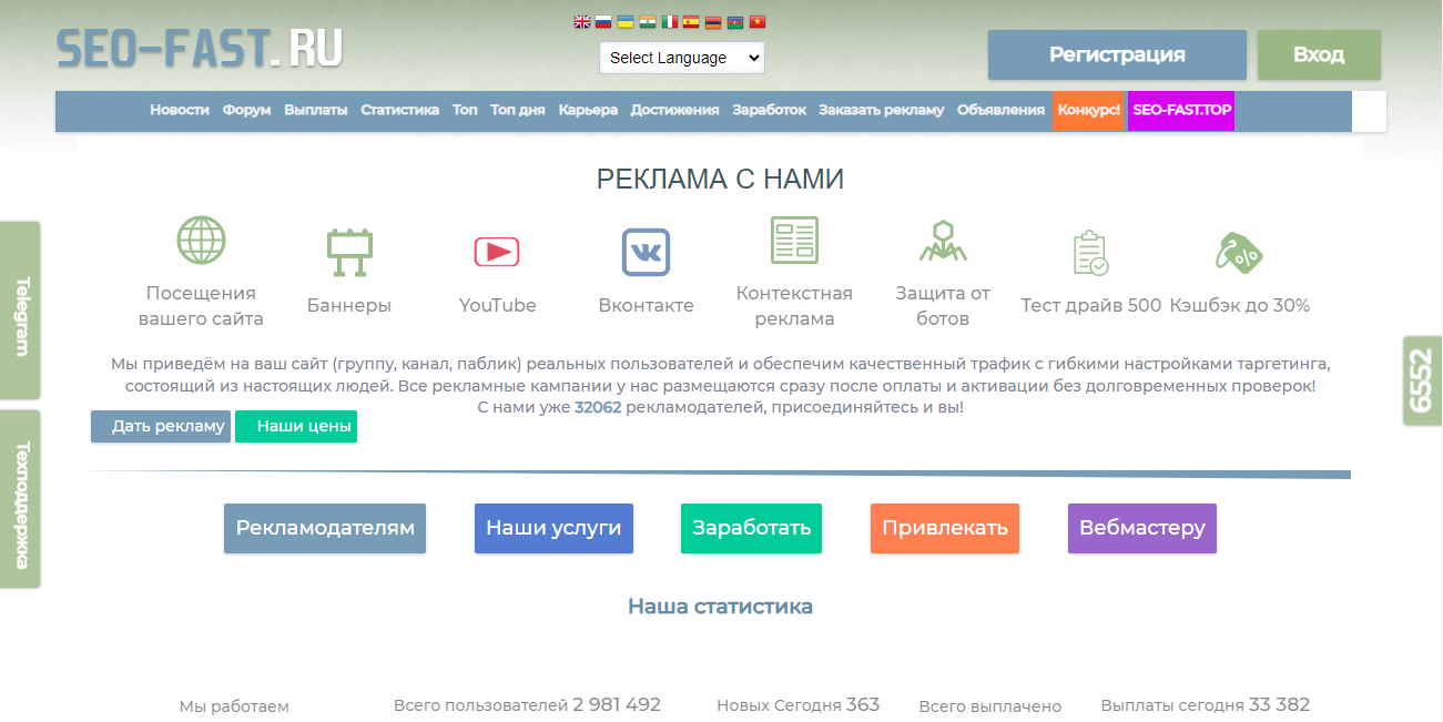 2) Для заказа рекламы требуется регистрация, мгновенное размещение рекламы.
